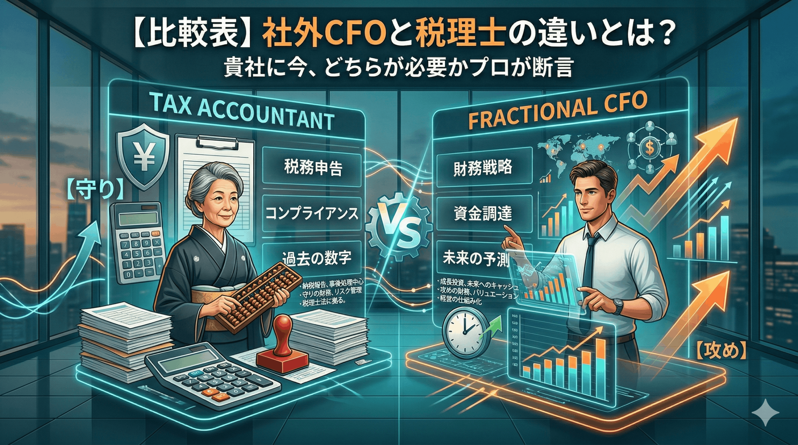 A8.全く問題ありません。むしろ推奨しております。 税理士は「過去の確定した数字を正しく処理する」役割ですが、社外CFOは「未来の数字をどう作るか」を議論する役割です。税理士先生から上がってくる決算データを、経営の判断材料(管理会計)へと昇華させ、事業を伸ばすための「攻めの材料」に変えていく。この役割分担により、貴社の経営体制はより強固なものになります。